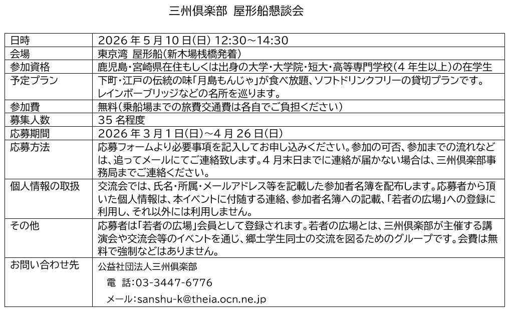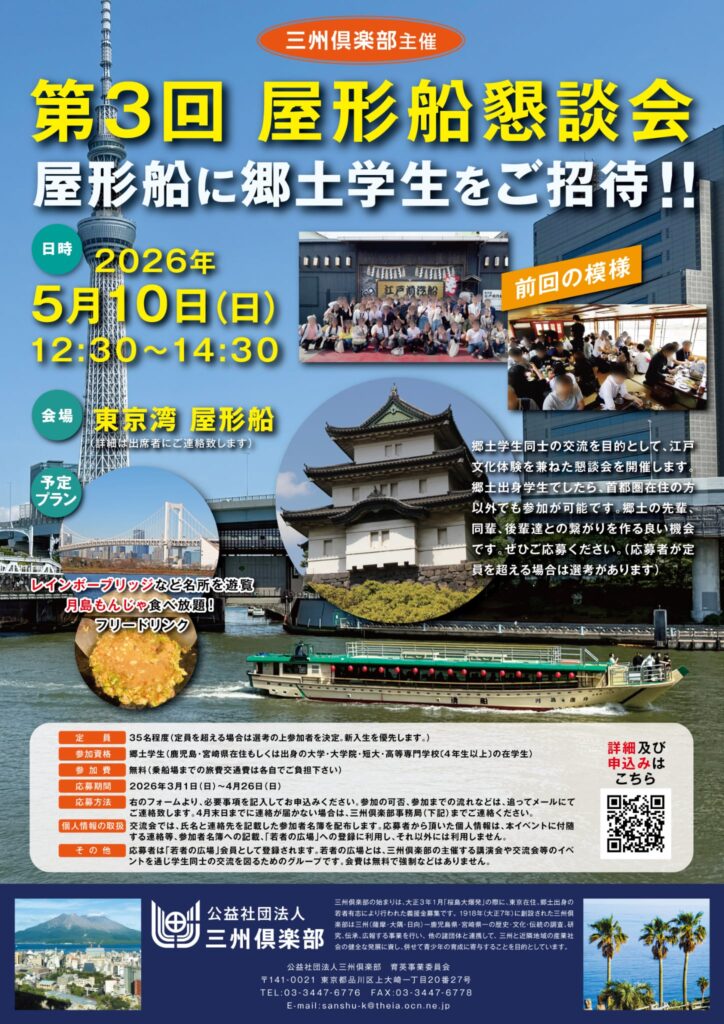 郷土学生同士の交流を目的として、屋形船体験を兼ねた懇談会を開催します。郷土ゆかりの学生でしたら、首都圏以外に在住の方でも参加が可能です。郷土の先輩・同輩・後輩達との繋がりを作る良い機会です。ぜひご応募ください。(応募者が定員を超える場合は選考があります)