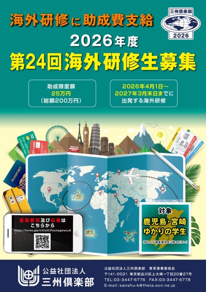 公益社団法人三州倶楽部育英事業の一環として、郷土学生が実施する海外研修費用の一部を助成します。